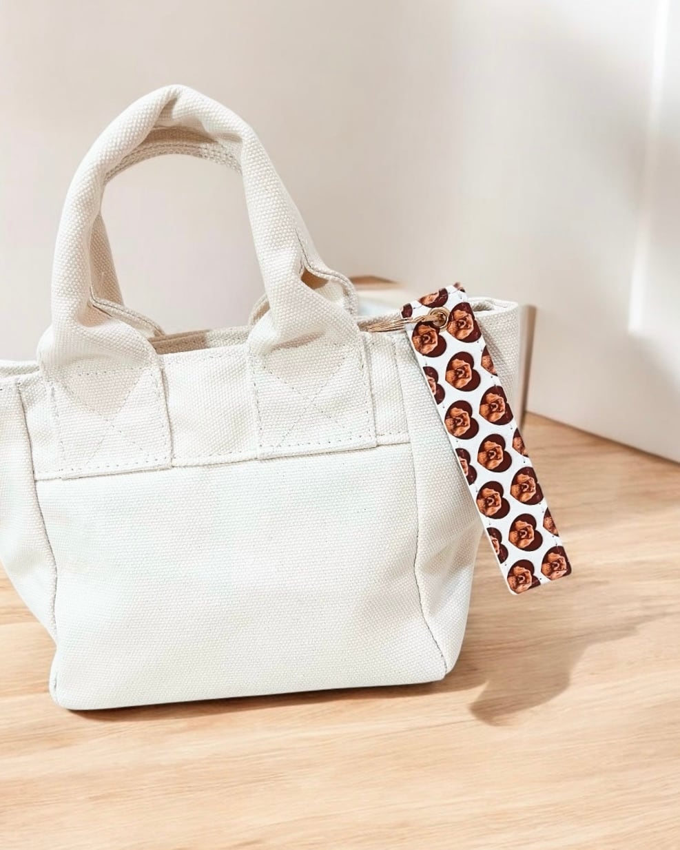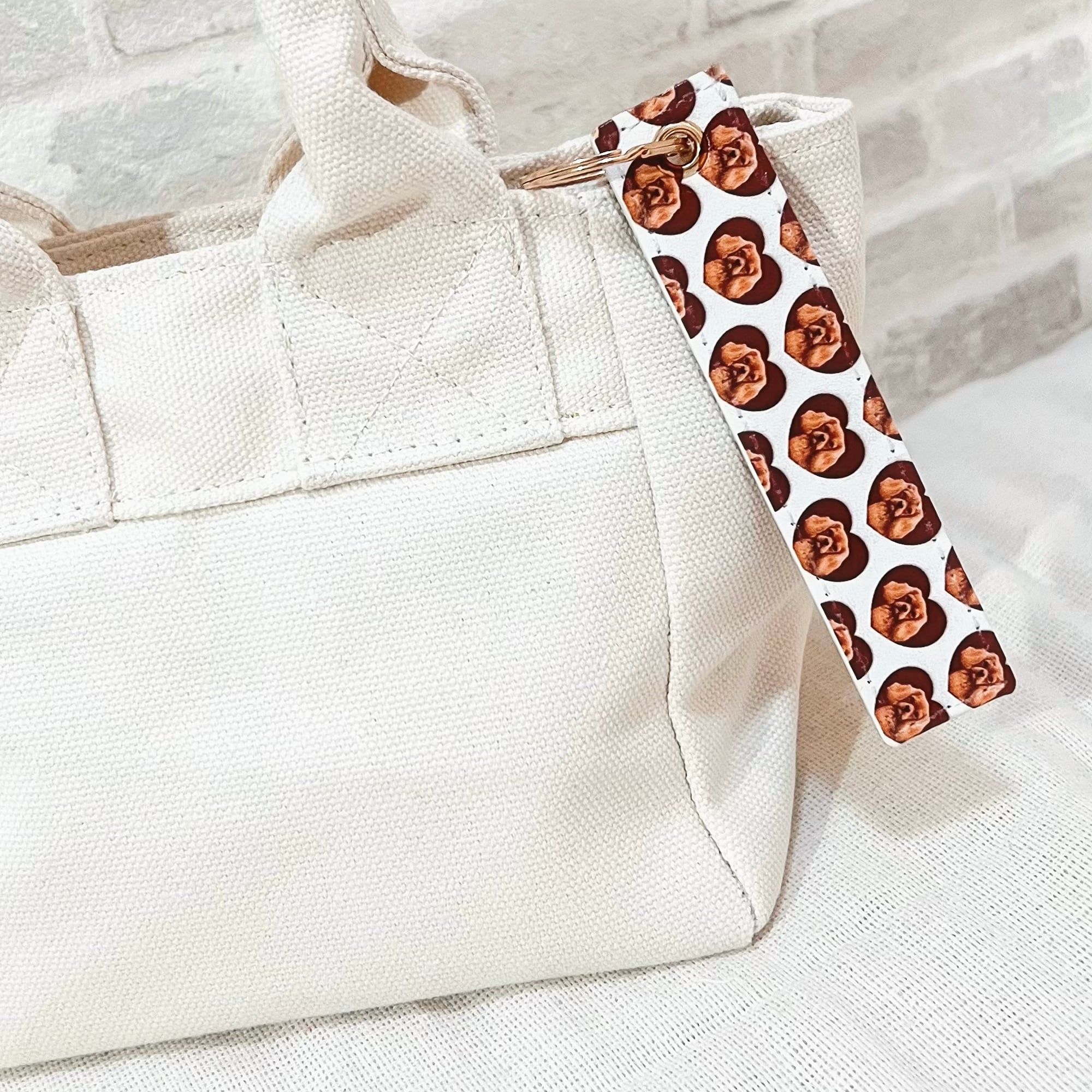 白ベースのレザーへ縫製後にプリントします。サイド,上下へ僅かな白ライン(縁取り)が含まれる場合がございます。